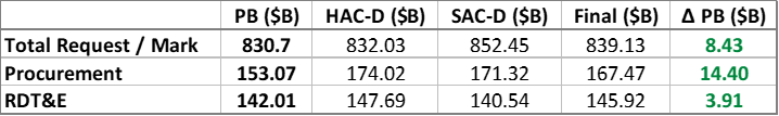 In the final bill, procurement misses out on the proposed bigger plus-ups in the individual House and Senate bills but still gets a healthy ~9% increase.