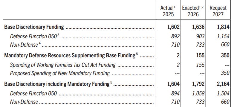 The Budget builds upon the historic $1T overall Defense topline for 2026 and requests $1.5T in total budgetary resources for 2027.