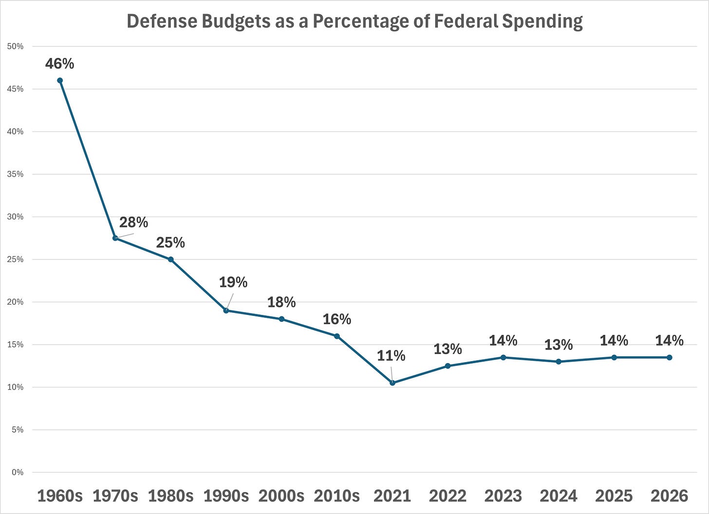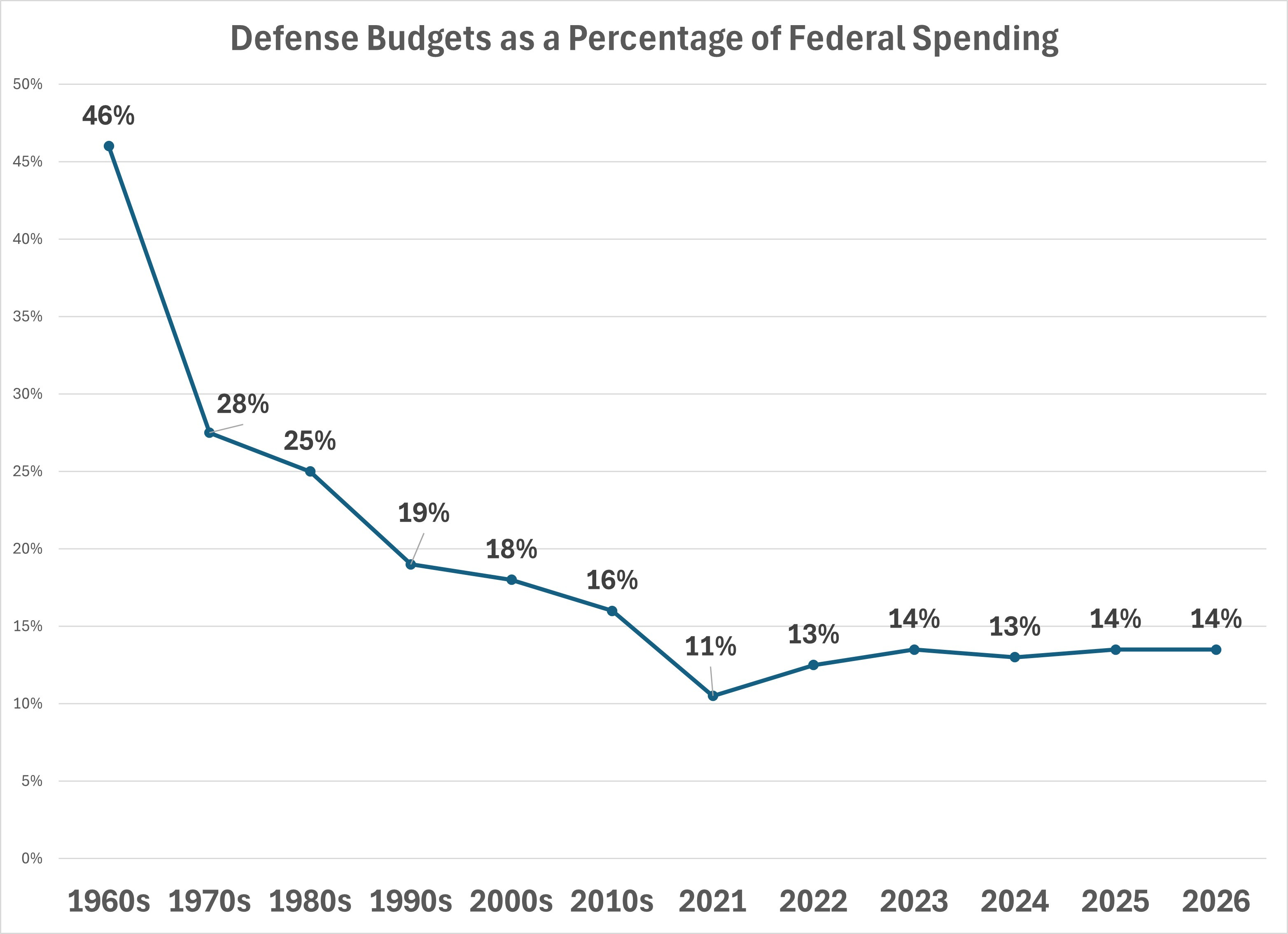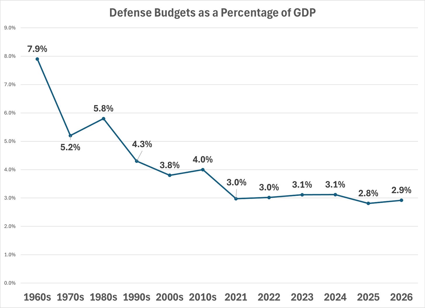 Defense spending, as a share of GDP, has fallen sharply since the 1960s Vietnam peak, the Reagan buildup, and post-9/11 surge. We’ve been around 3% in recent years.