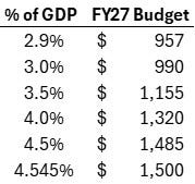 GDP estimates for 2027 hover around $33T. A $1.5T defense budget would be 4.5% of GDP. This aligns with Cold War-era norms, yet far below Vietnam/Reagan peaks, but a prudent step up from today’s ~3%.